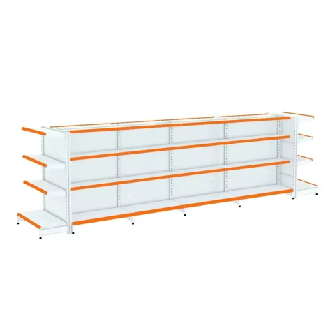 KIT GÔNDOLA CENTRO 137 FIT AMAPÁ 40/30 BRANCO PARA VÃO DE ATÉ 4,70 METROS COM DUAS PONTAS - 40 BANDEJAS PORTA ETIQUETA LARANJA