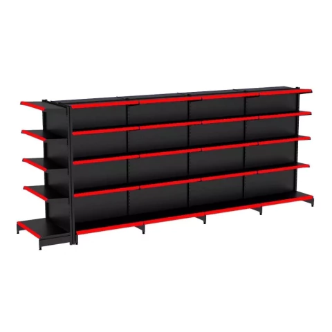 KIT GÔNDOLA CENTRO 170 FIT AMAPÁ 40/30 PRETO PARA VÃO DE ATÉ 4,50 METROS COM UMA PONTA E 45 BANDEJAS PORTA ETIQUETA VERMELHO