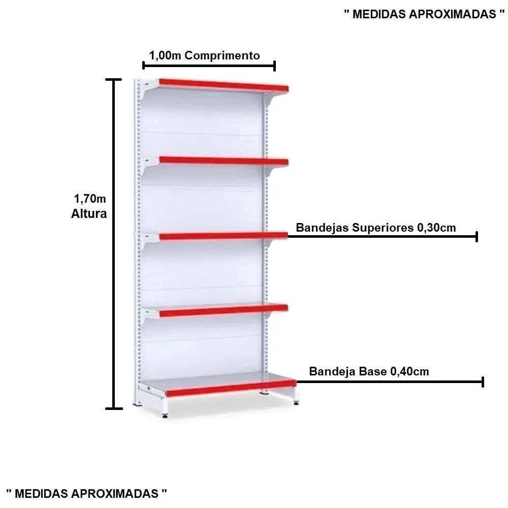 Inclinação da bandeja em 3 posições e fundo quadrado para melhor exposição. Possui bandejas reguláveis na coluna a cada 25mm, o que permite adição de bandejas extras. Sistema de reforço que permite maior capacidade de carga. Ponteira de coluna para mais proteção e durabilidade. Possui travador de parede, item obrigatório para uma instalação com segurança. O número de bandejas varia de acordo com altura;