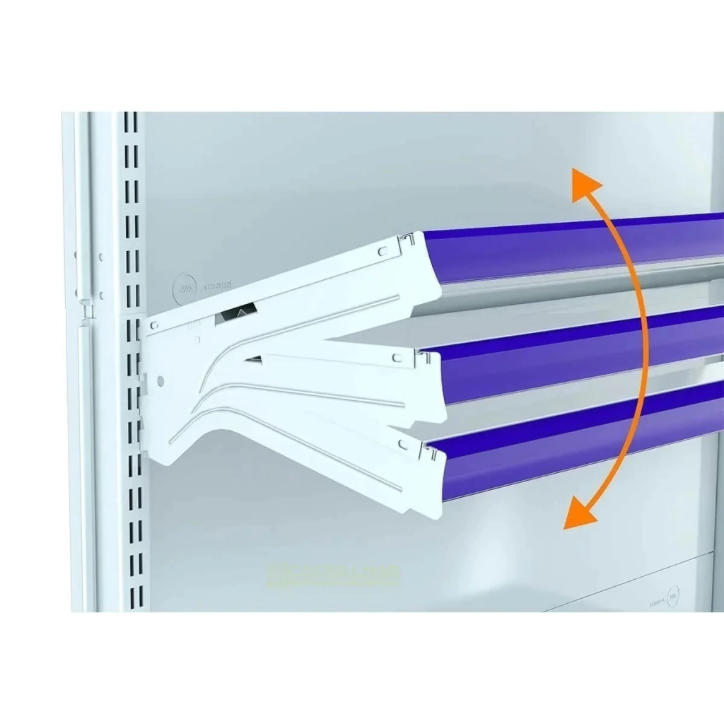 Inclinação da bandeja em 3 posições e fundo quadrado para melhor exposição. Possui bandejas reguláveis na coluna a cada 25mm, o que permite adição de bandejas extras. Sistema de reforço que permite maior capacidade de carga. Ponteira de coluna para mais proteção e durabilidade. Possui travador de parede, item obrigatório para uma instalação com segurança. O número de bandejas varia de acordo com altura;